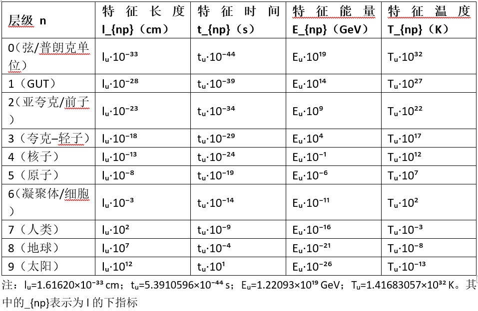 依據現代物理學的一般研究和最新的這些研究成果,人們可以一般地定義第 n 層「普朗克區域」為從第 n 層尺度延伸到第 (n+1) 層尺度。研究內容包括:第 n 層物質的動力學,以及第 n 層不同物質如何群集並構成第 (n+1) 層物質的物質群動力學。故有: