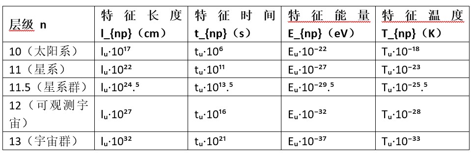 此外,這些研究推導了四個不變常量:對於任意n級尺度的物質系統,其特徵能量與長度的積 C_1 = cℏ ≈ 197.3269618 MeV·fm、能量與時間的積 C_2 = C_1 / c、溫度與長度的積 C_3 = C_1 / k(k為玻爾茲曼常數)、溫度與時間的積 C_4 = C_1 / (c k)。這些乘積都是等於物理學中的常量,這意味著,無論n取任何值,尺度、能量、時間和溫度之間的以上乘積的互為反比例關係始終不變,符合物理中的重整化群不變性(Renormalization Group Invariance)——系統在不同尺度下自相似,如分形結構。這些是非常精確的調整,以實現我們能夠觀測到的這非常有規律的不同層級自相似的一切。