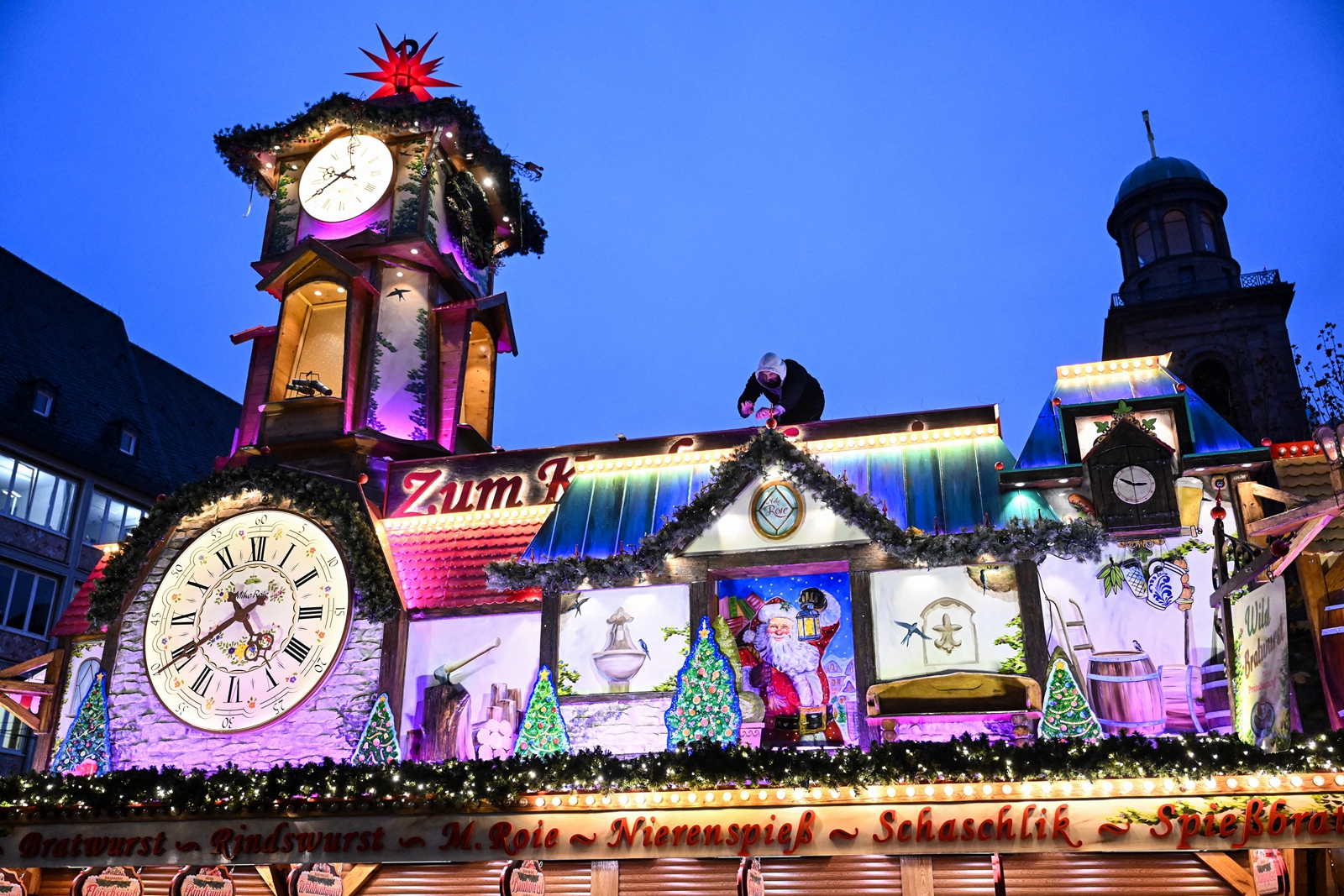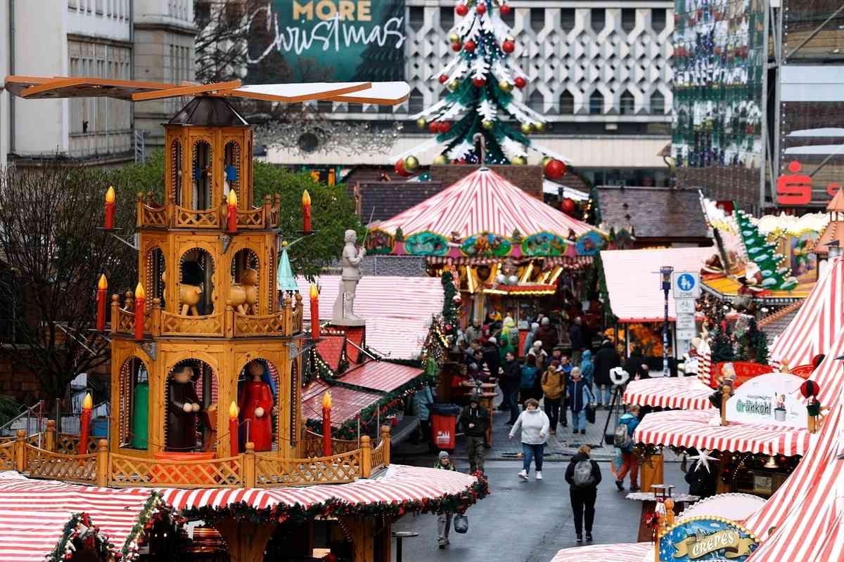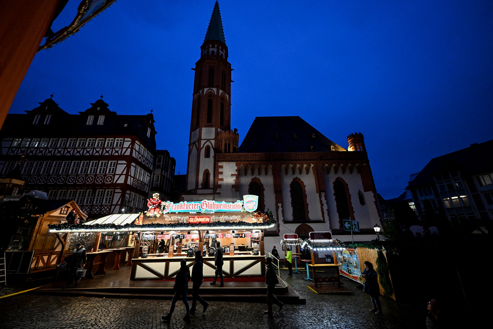 2025年11月19日,在奧地利薩爾斯堡聖誕市場(Salzburg Christmas market),一棵巨大的聖誕樹被點亮。(Barbara Gindl/APA/AFP via Getty Images)
