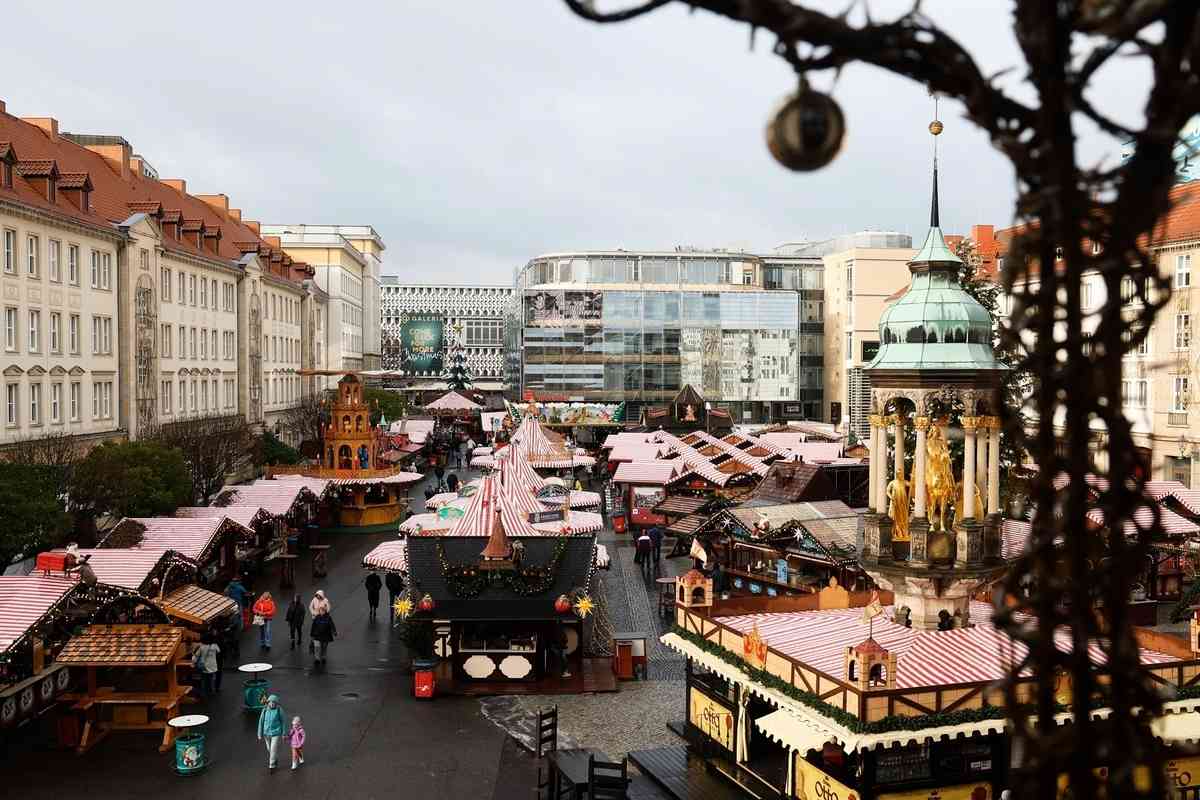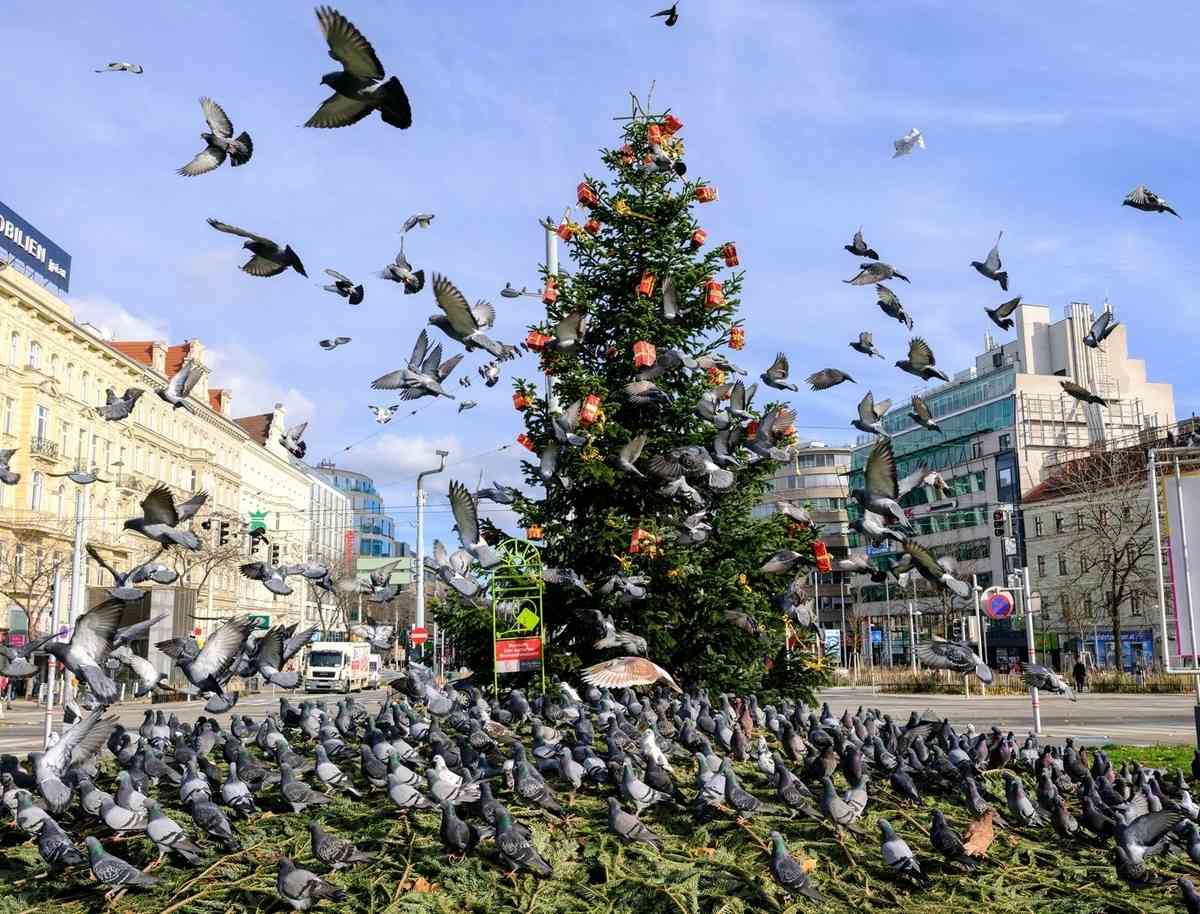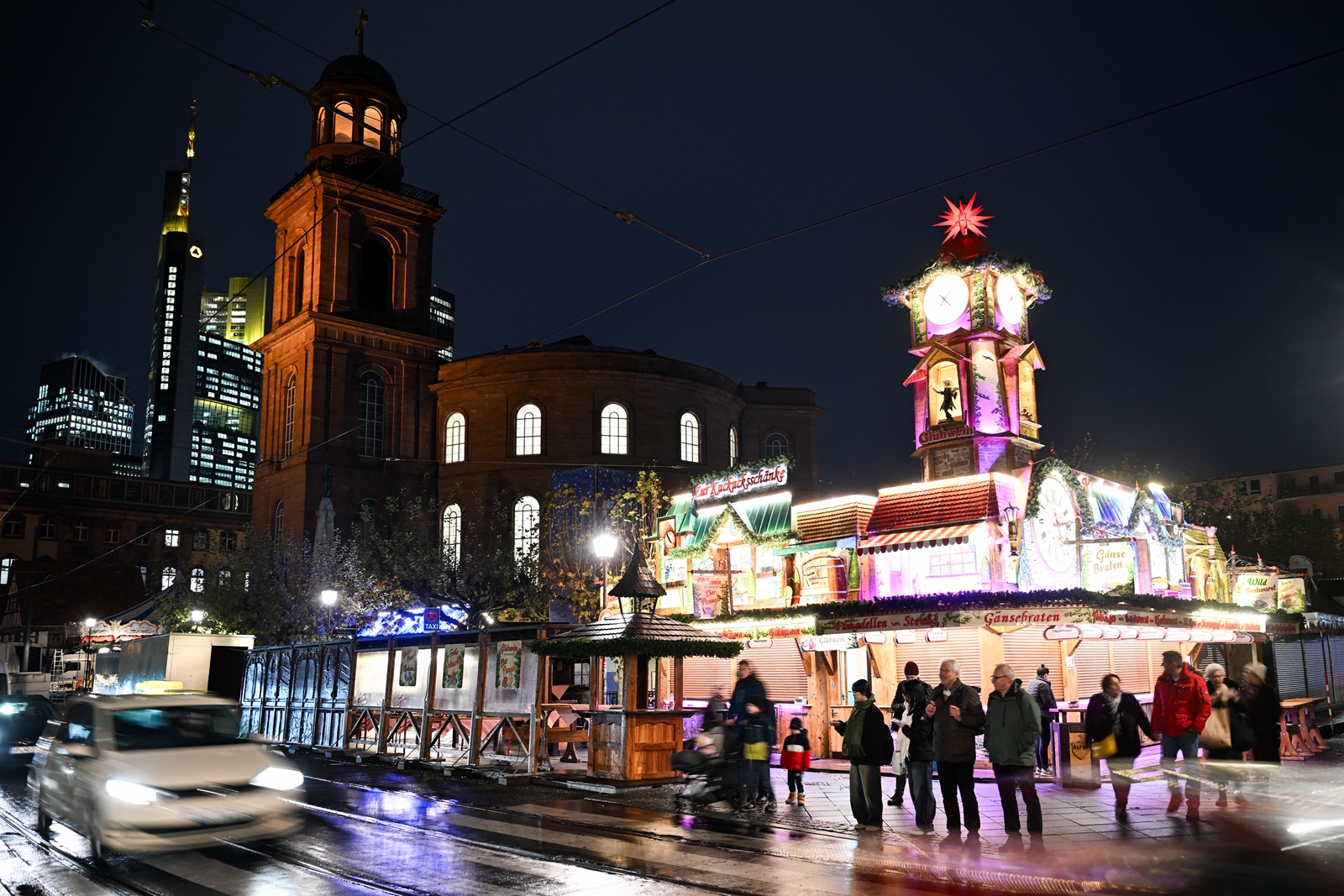 2025年11月19日,在奧地利薩爾斯堡聖誕市場(Salzburg Christmas market),一棵巨大的聖誕樹被點亮。(Barbara Gindl/APA/AFP via Getty Images)