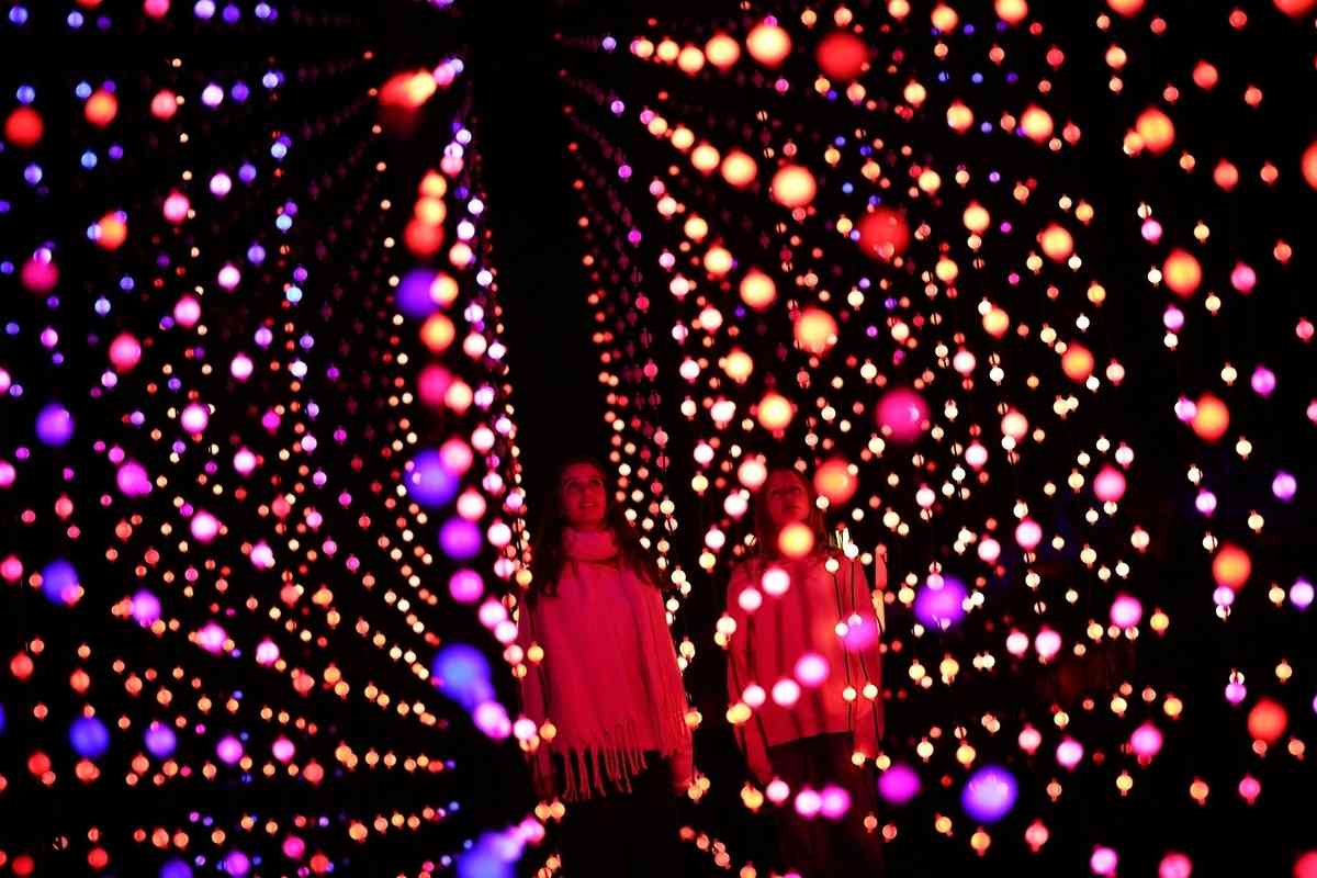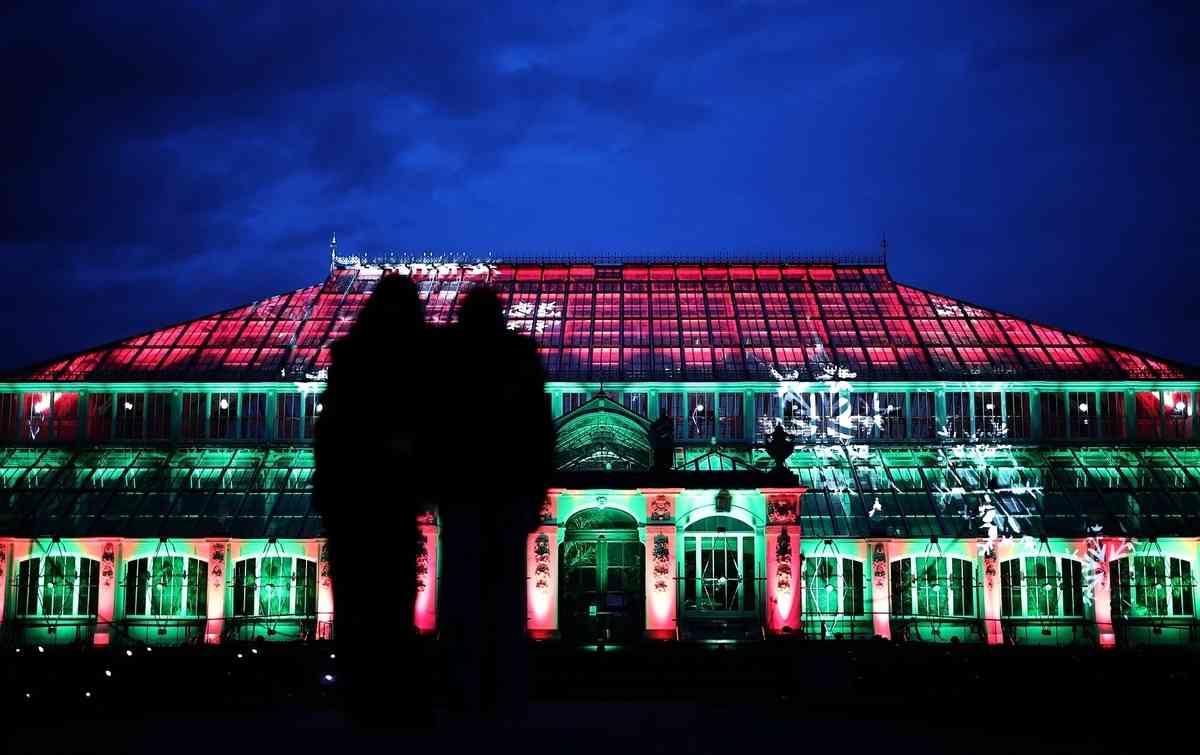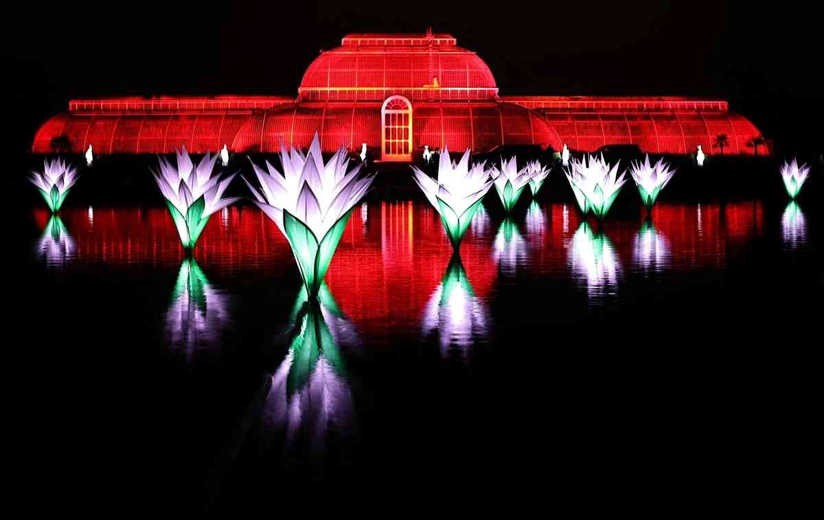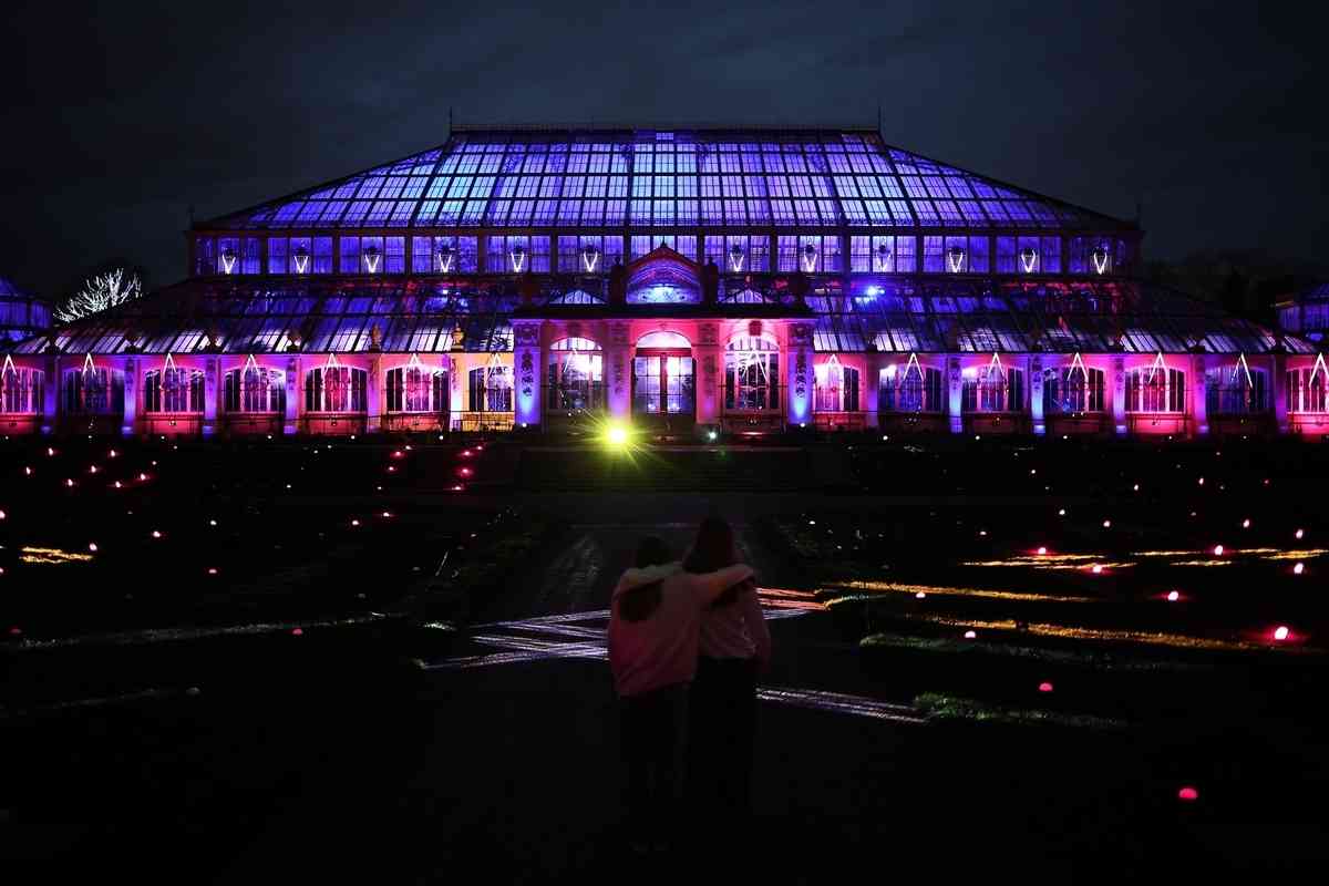 2025年11月13日,英國王家植物園林邱園開啟「聖誕燈光秀」,夜幕下的邱園化身為光影舞台。溫帶植物館外的燈光秀閃耀奪目,各式燈光裝置、八種全球獨家裝置構成的「燈光交響樂團」,從沉思靜謐到歡樂爵士,營造出多層次的節日氛圍。(Henry Nicholls/AFP via Getty Images)