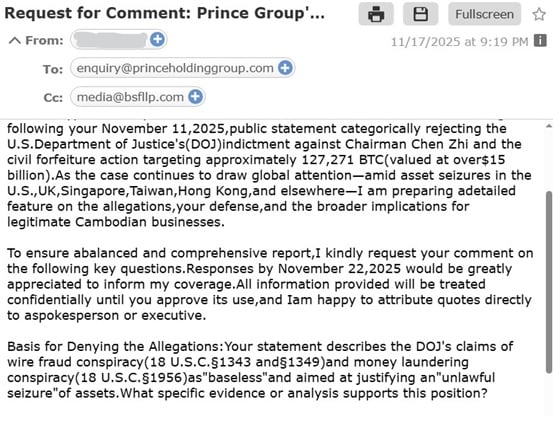 記者於11月17日向太子集團及其聘請的律師事務所Boies Schiller Flexner LLP就美國司法部指控依據、太子集團資金來源、陳志下落等關鍵問題通過電子郵件發送公開求證函,表明希望在11月22日之前得到答覆,但截至11月24日文本成稿,未獲太子集團及其聘請的律師事務所回應。