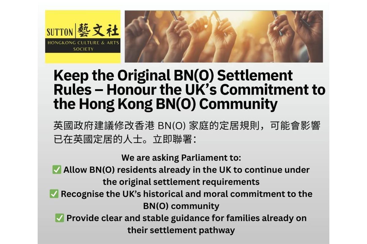 不少移英港人批評英國政府突然「搬龍門」、違反2021年對港人的承諾,增加申請永居的難度。英國國會「後座議員事務委員會」(Backbench Business Committee)今日(25日)將就移民白皮書對BNO等簽證途徑影響舉行辯論,港人組織「Sutton藝文社」近日發起聯署行動反對新增的永居門檻,在兩日之內已收到超過28,600個聯署。