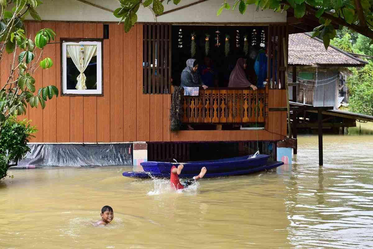 2025年11月25日,泰國南部那拉提瓦府(Narathiwat)Mueang縣Ban Yakang區發生嚴重洪澇災害,當地兒童在洪水中游泳玩耍。(Madaree Tohlala/AFP via Getty Images)