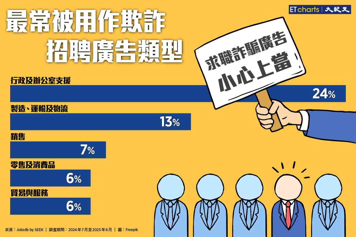 Jobsdb by SEEK調查發現,2024年7月至2025年6月期間,最常被用作欺詐活動的招聘廣告類型主要集中在行政及辦公室支援職位,佔比最高達24%;其次為製造、運輸及物流類別,佔13%;銷售職位佔7%;零售及消費品及貿易與服務則各佔6%。