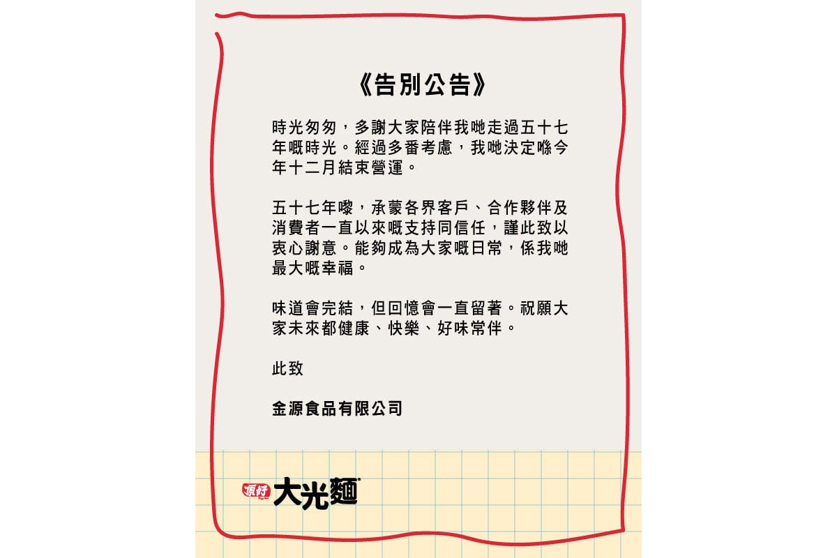 有57年歷史、出產本地即食麵「頂好大光麵」的金源食品有限公司今早(26日)公布,將於12月結束營運。金源食品上午約10時於社交媒體上交代決定,指公司經多番考慮後將於12月停運,並感謝顧客、合作夥伴及食店多年支持,但未有具體透露原因。