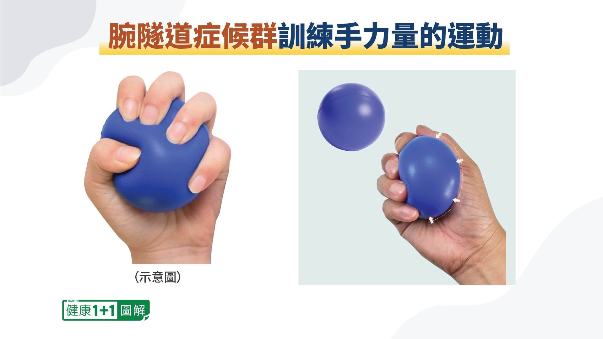 握力球:將有彈性的球放在手心,做擠壓動作,這個動作可以鍛鍊大拇指肌肉,改善神經病變引起的肌肉萎縮。