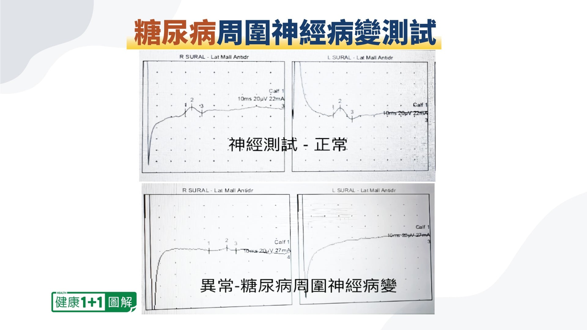 在神經病變的檢查方面,除了檢查對刺痛、撫摸、溫度的感知,還會以微弱電流刺激神經並觀察反應波形,藉此判斷是否受損及其嚴重程度。