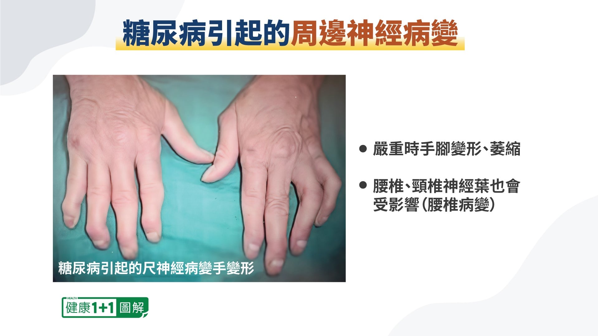 3、手、腳出現變形,糖尿病足是常見的變形問題;手的變形也可能發生,例如小指和無名指彎曲,通常表示尺神經受到影響。