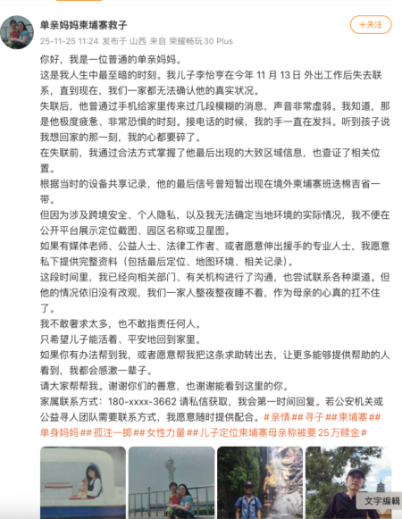 稍早,「單親媽媽柬埔寨救子」在微博發布的訊息說,11月13日,兒子李怡亨外出工作後失去聯繫,直到現在,一家人都無法確認他的真實狀況。