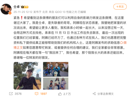 11月25日,演員仝卓發布求助訊息,11月13日,一起長大的弟弟在外出工作後失去聯繫,家人通過各種方式找人,已掌握最後一次出現的位置,並附帶了其阿姨的微博帳號「單親媽媽柬埔寨救子」發布的詳細求助訊息。
