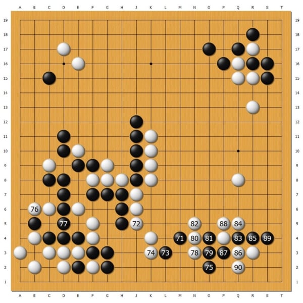 中盤階段,井山裕太展現良好大局觀,全盤考慮後,在右半邊形成巨大模樣。楊楷文本就是治孤好手,黑71隨即打入黑陣,引發激戰。而井山的攻擊力也不遑多讓,雙方在右下角硬碰硬,展開一場矛和盾的對決。