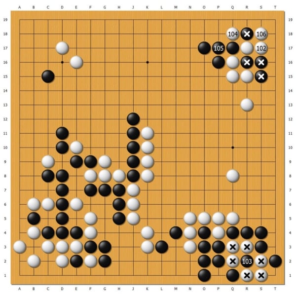 最終形成劫爭,楊楷文萬劫不應,吃住白數子,不過卻是一筆賠本買賣。井山裕太利用打劫,在黑右上角連走兩步,鳩佔鵲巢,形成轉換,無論從目數還是厚薄上都一本萬利,一舉奠定勝局。