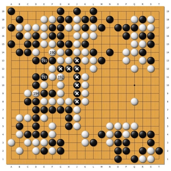 此後,井山裕太繼續利用厚勢擴大戰果,吃住黑中央八子。楊楷文無以為繼,行至白194手,停鐘認輸。