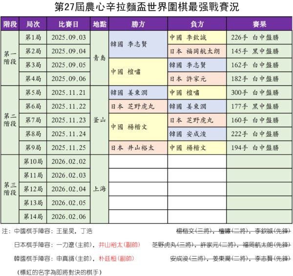 11月25日,第27屆「農心盃」三國圍棋擂台賽又賽一場,日本隊副帥井山裕太完勝中國隊三將楊楷文,為第二階段比賽畫上句點。至此,中、日、韓三國都只剩主教練、副帥二人,基本戰成平手。
