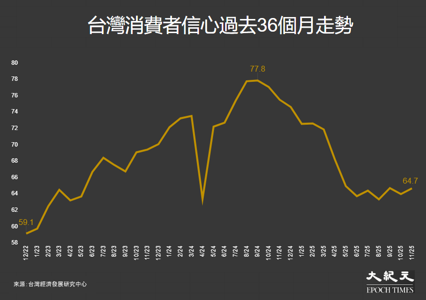 台灣經濟發展研究中心於27日公布最新消費者信心指數(Consumer Confidence Index,CCI)從10月的63.96點上升至11月的64.65點。CCI點數在0至100反映「悲觀」、100至200反映「樂觀」,問卷全部以「未來半年」對各事件看法為時間性標準。