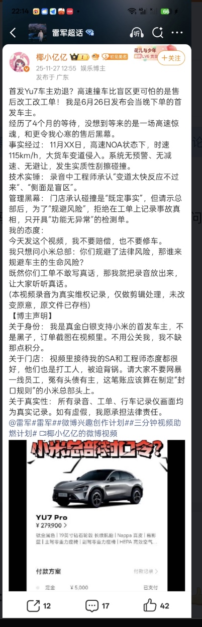 27日當天,另一位自稱「首發Yu7車主」發帖控訴,11月某日,在高速NOA狀態下,遭遇大貨車變道入侵,系統無預警、無減速、無避讓,發生了刮擦碰撞。事故後,小米工程師承認「變道太快反應不過來」「側面是盲區」。但門店請示小米總部後,為了「規避風險」,拒絕在工單上記錄事故真相,只開具「功能無異常」的檢測單。