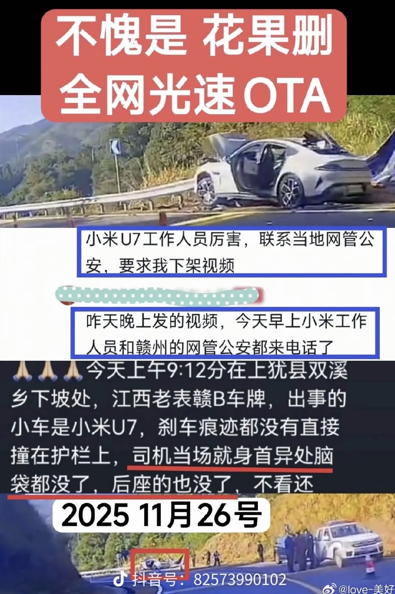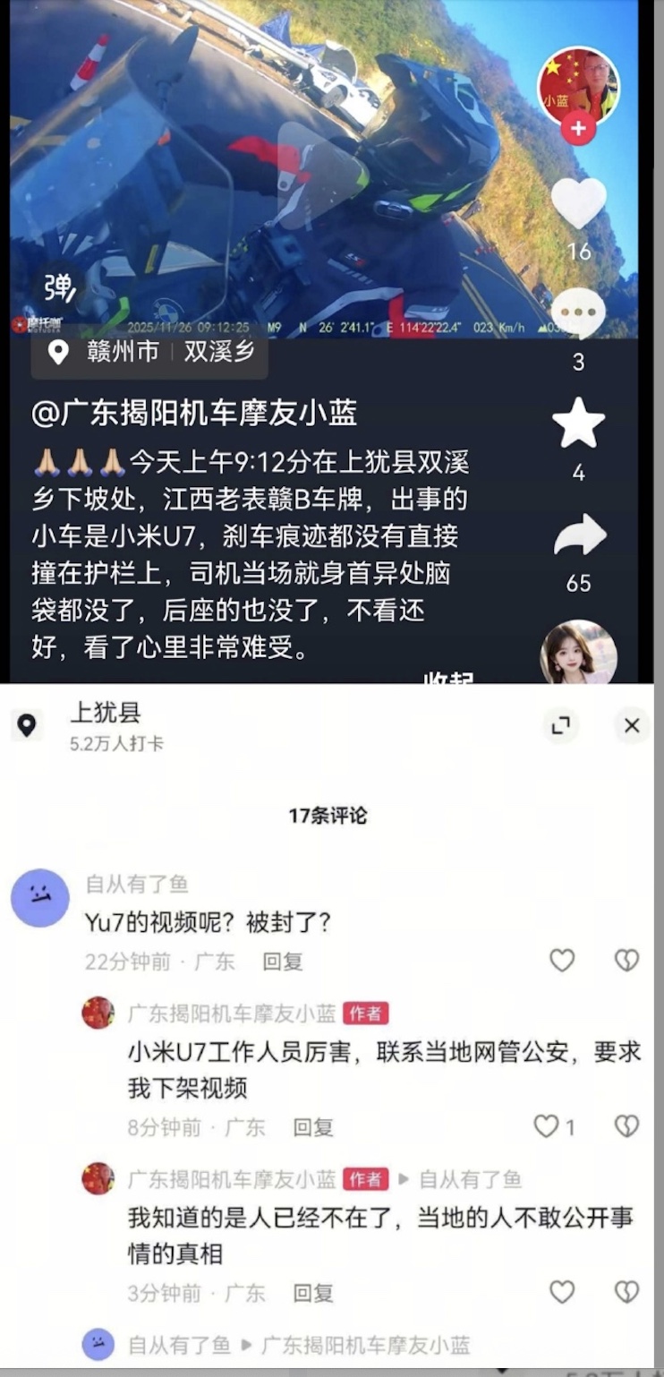 11月26日,網民「廣東揭陽電單車摩友小藍」在抖音平台發影片稱,今天上午9點12分,在上猶縣雙溪鄉下坡處,江西贛B車牌的一輛小米SU7直接撞上路邊護欄,煞車痕跡都沒有,司機當場身首異處,並且「后座的(人也)沒了」。