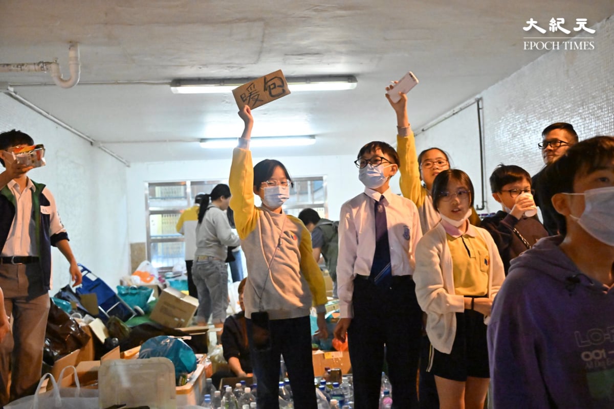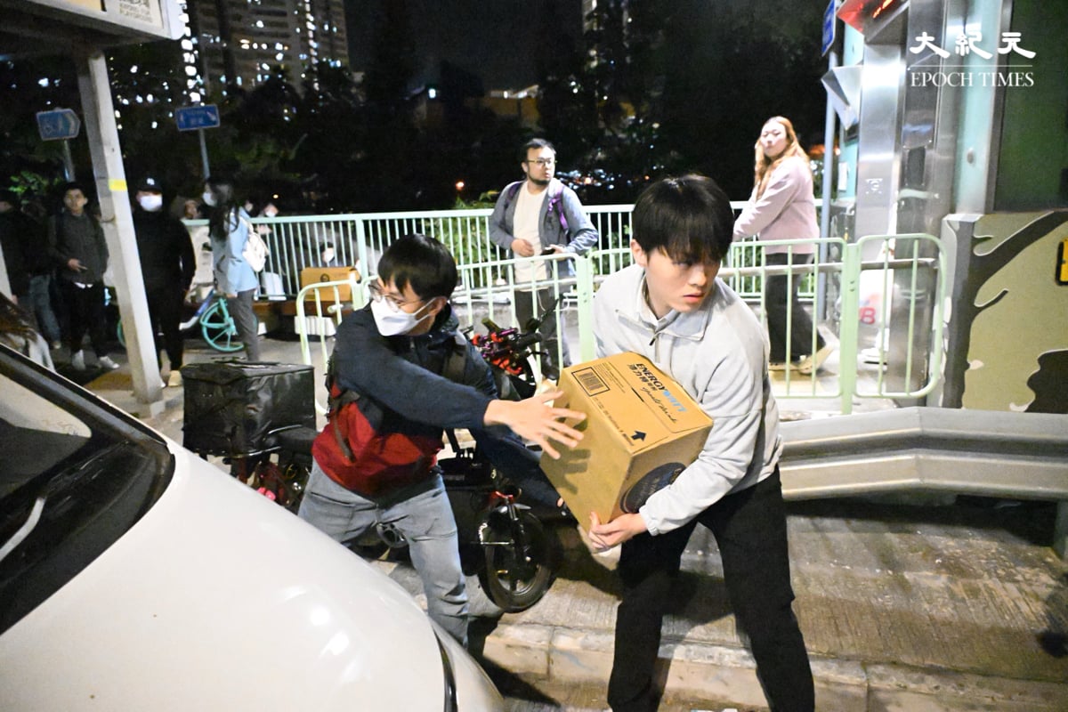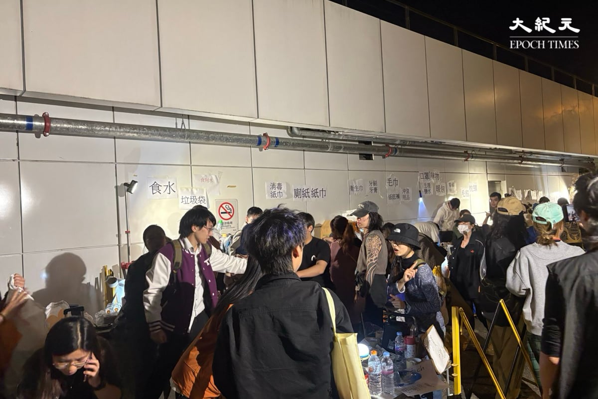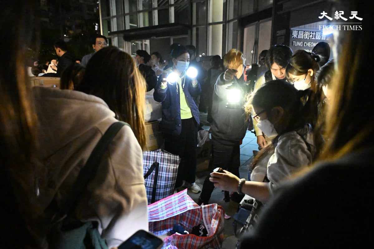 距離火場百多米之遙的廣福邨平台,入夜後物資站持續運作,有熱心居民製作站內平面圖,以協助義工分流各類送抵的物資。而每當遇到大件或較多數目的物資,現場義工會迅速組成人鏈運送,亦會因應網上支援群組的呼籲,調派人手到對面的東昌街體育館增援。與此同時,社工、中醫乃至小學生均齊集平台,務求盡為災民送暖。