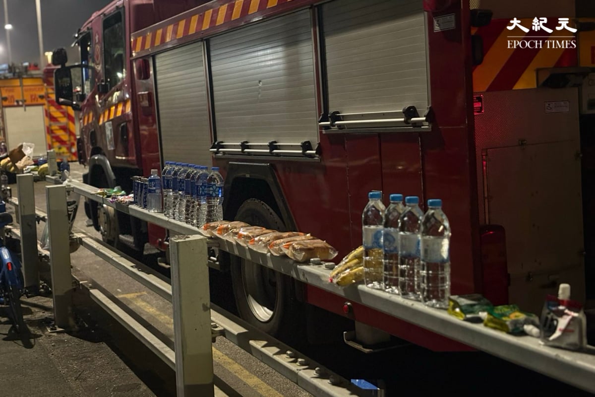 由港鐵大埔墟站至在災場旁邊的廣福邨路上,昨(28日)晚9時許已堆滿物資。不少市民步行或踩單車魚貫而入,部分也帶同物資,在物資站外等候捐贈或分發,沿路有義載的私家車、的士、貨車停泊。