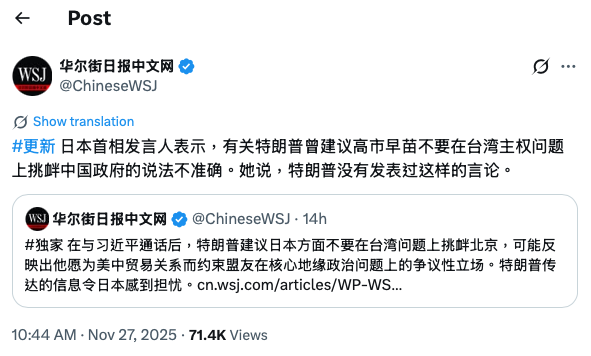 目前,《華日》已在社交平台X上「更新」稱,「日本首相發言人表示,有關特朗普曾建議高市早苗不要在台灣主權問題上挑釁中國政府的說法不準確。她(應為『他』)說,特朗普沒有發表過這樣的言論。」