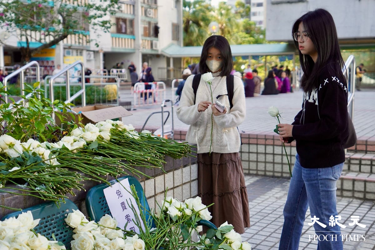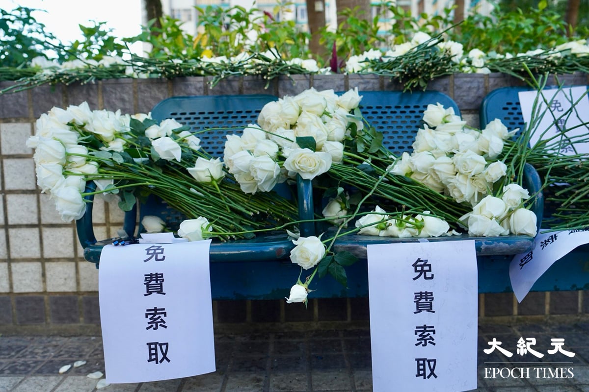 與宏福苑相鄰的廣福邨亦有大量市民持白花、雙手合十悼念,一旁有長椅上放滿悼念用的白玫瑰,並留有字條「免費取用」。@