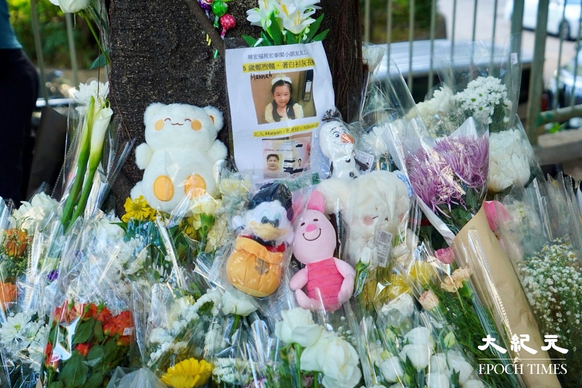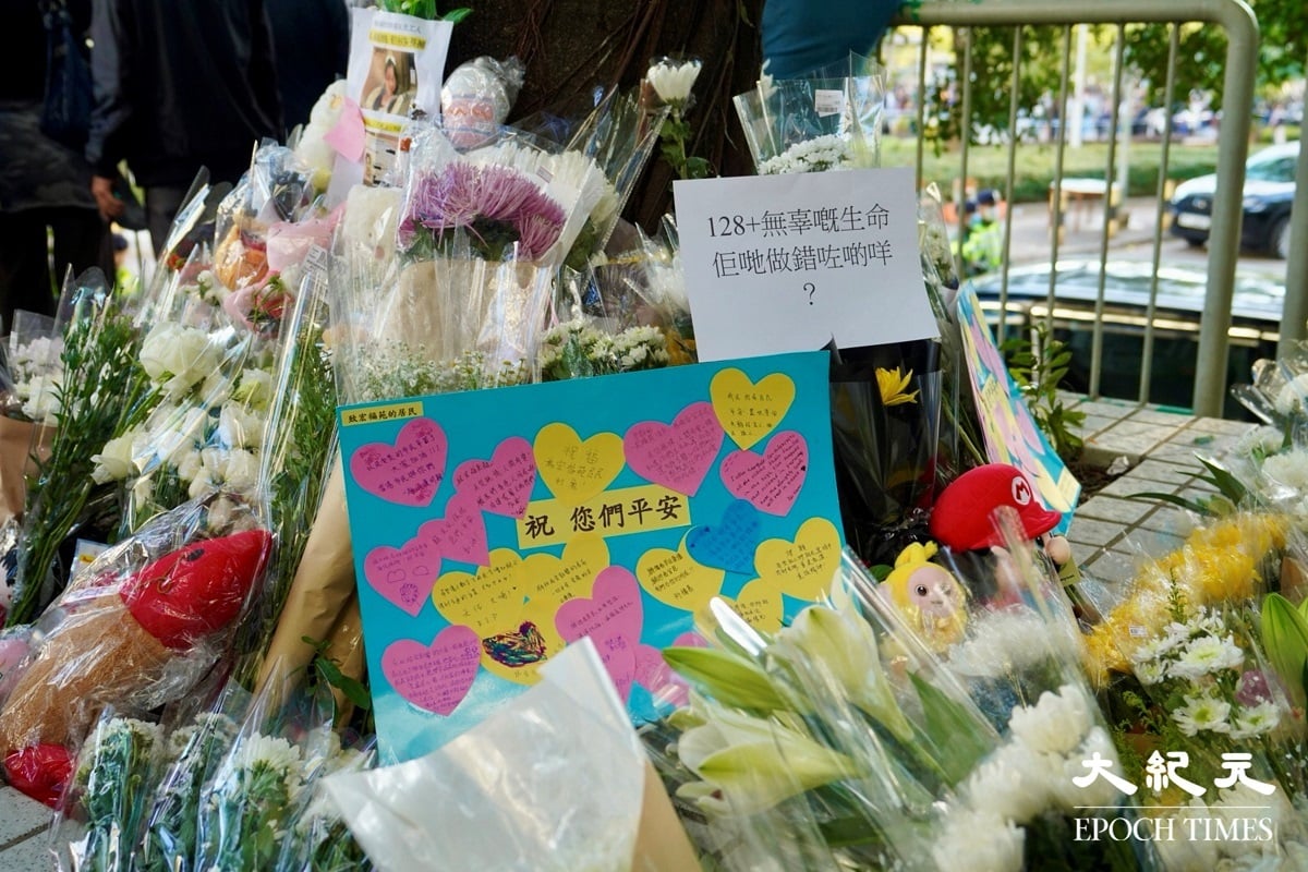 在宏福苑對開的廣福休憩處,大批市民前來獻花悼念,其中一個燈柱下放滿花和悼念的卡片,有卡片寫著「天佑(祐)大埔、天佑(祐)香港、逝者安息、生者堅強」,燈柱上還掛著兩個公仔。