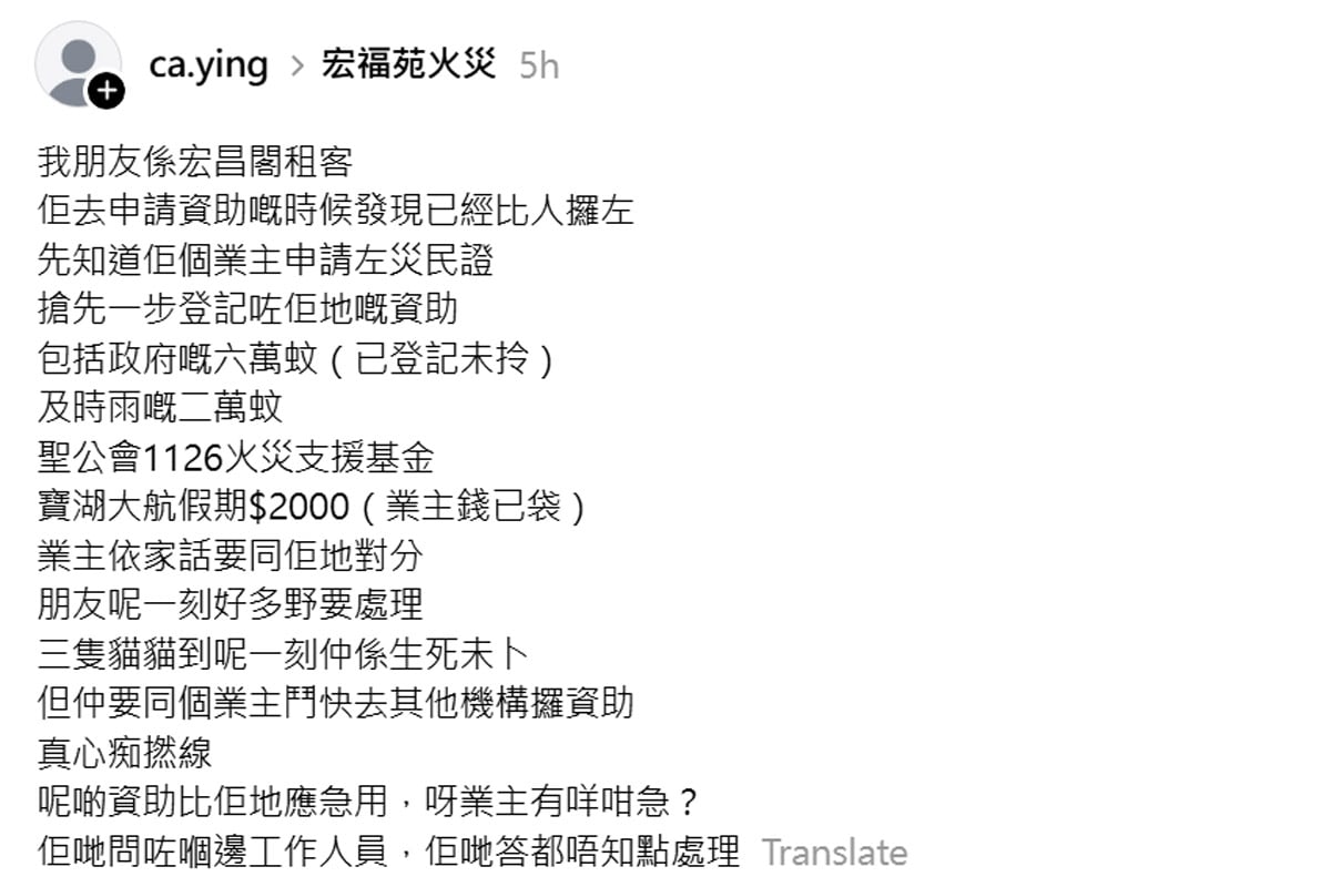 有網民在Threads上發帖文,表示她的朋友是宏昌閣的租客,在嘗試申請資助時,發現款項已被人領取。之後得悉原來業主已申請了災民證,並登記了多項援助金。
