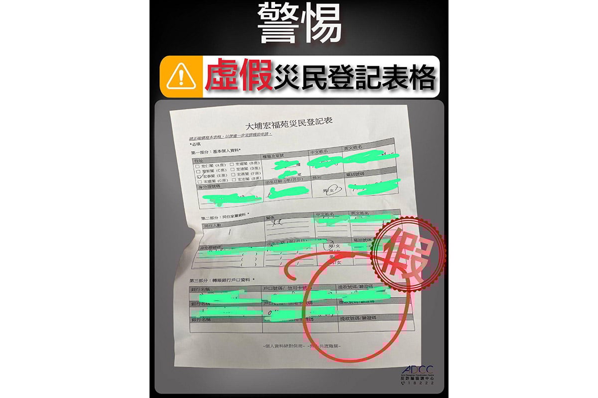 警方表示,發現有騙徒懷疑假扮義工,使用虛假的「大埔宏福苑災民登記表」混水摸魚,騙取個人資料、銀行及信用卡資料,甚至要求填寫驗證碼。