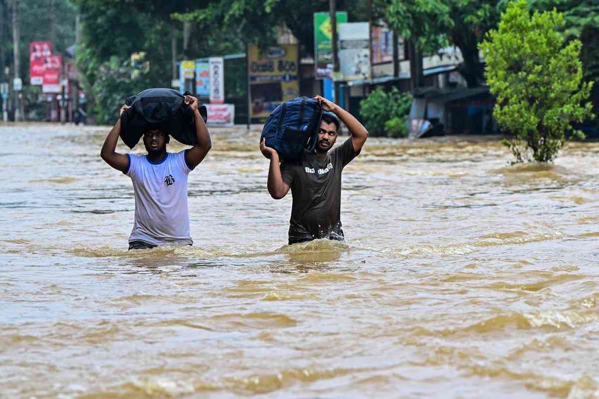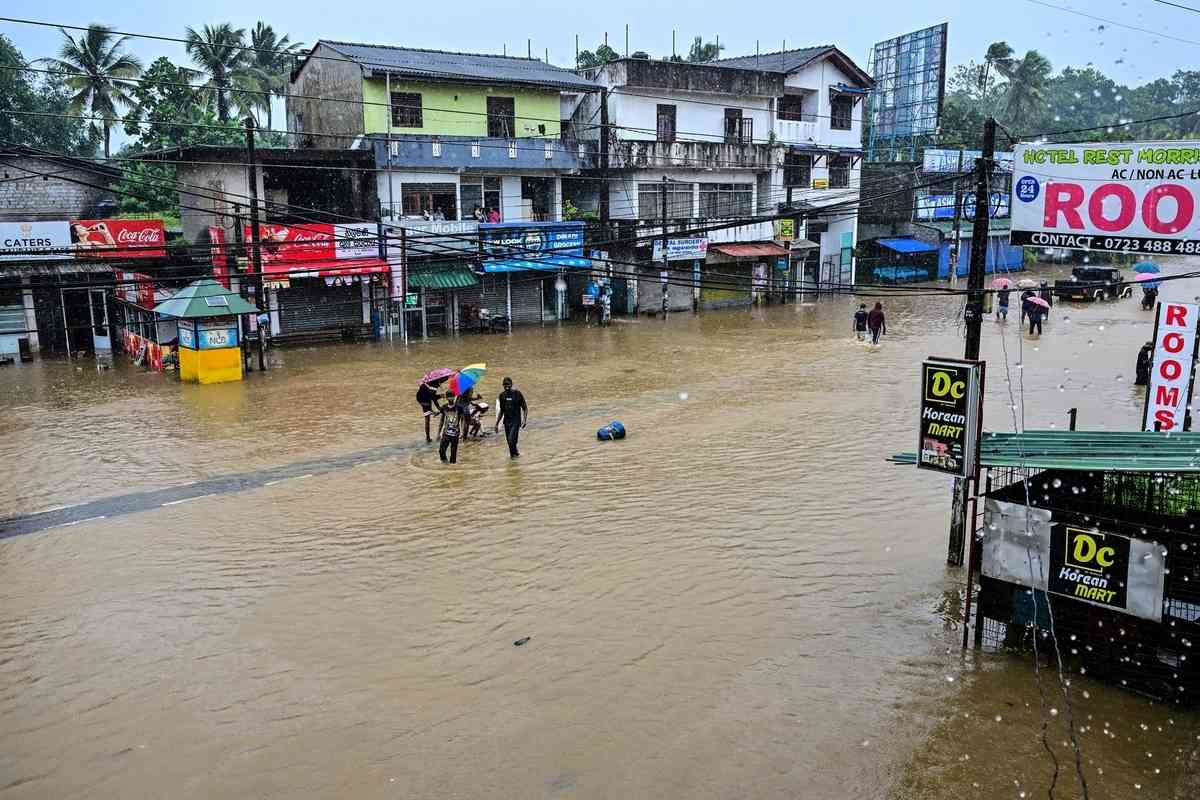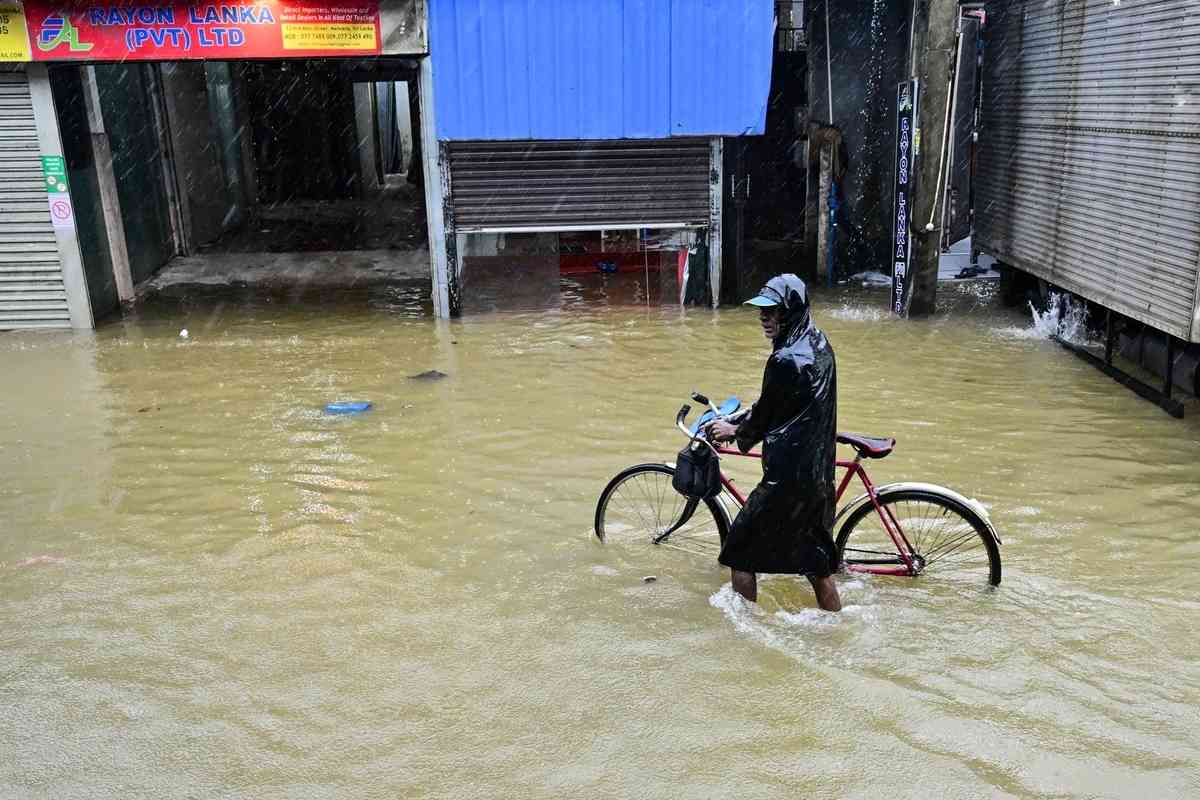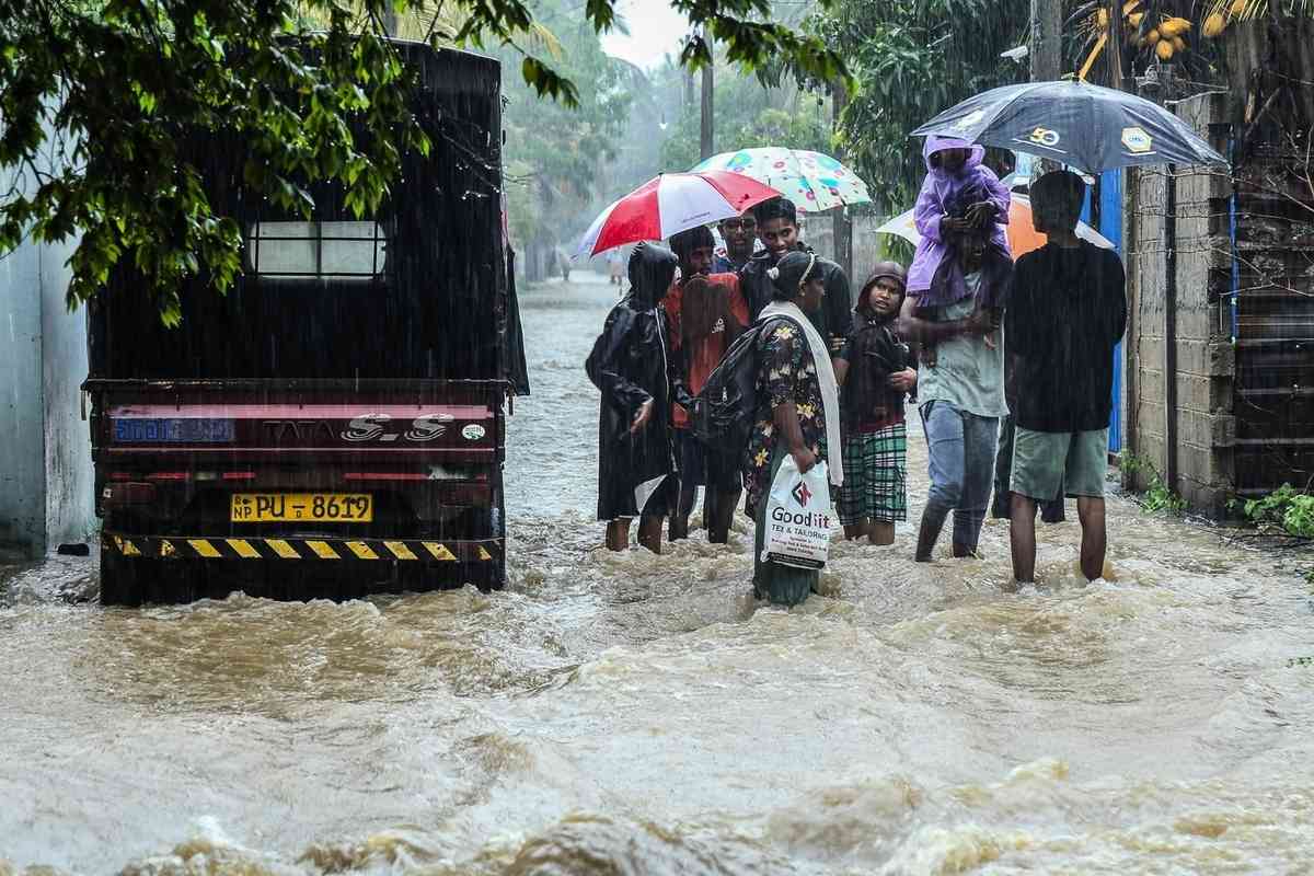 2025年11月28日,科倫坡郊區卡杜韋拉(Kaduwela)遭遇強降雨後,當地居民被迫涉水而行。(Ishara S. KODIKARA / AFP via Getty Images)
