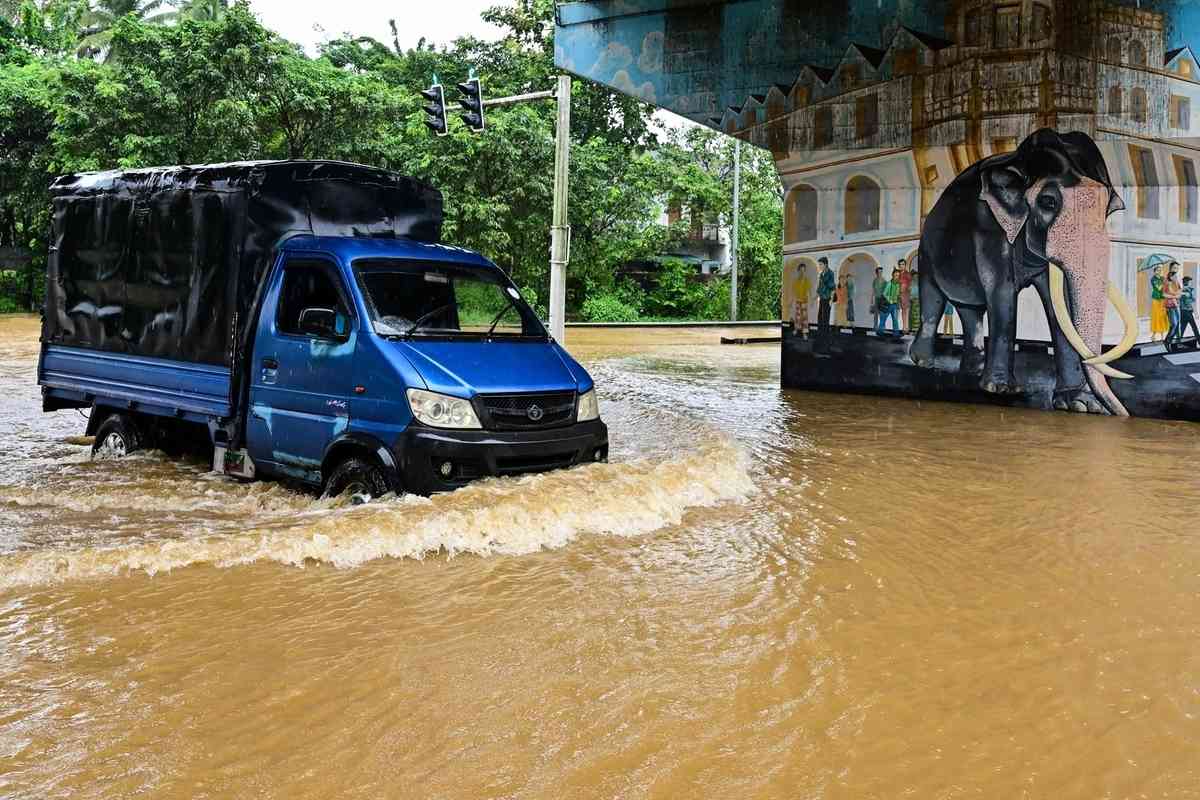 2025年11月28日,科倫坡郊區卡杜韋拉(Kaduwela)遭遇強降雨後,一輛汽車駛過被洪水淹沒的街道。(Ishara S. KODIKARA / AFP via Getty Images)