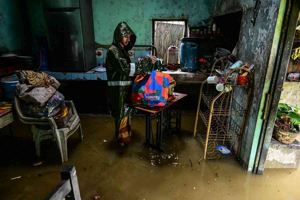 2025年11月28日,科倫坡郊區卡杜韋拉(Kaduwela)遭遇強降雨後,一名男子站在自家被水淹的房子裏收拾行李。(Ishara S. KODIKARA / AFP via Getty Images)
