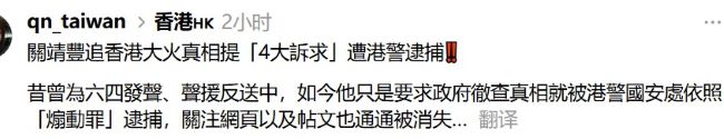 幾名香港年輕人組成的「大埔宏福苑火災關注組」日前發起網絡聯署,要求港府及警方徹查這次火災的真相。僅僅一天後,互聯網上就傳出發起人之一的關靖豐,29日已被警方國安處依照「煽動罪」拘捕的消息,聯署的網頁以及相關帖文隨即也被消失。
