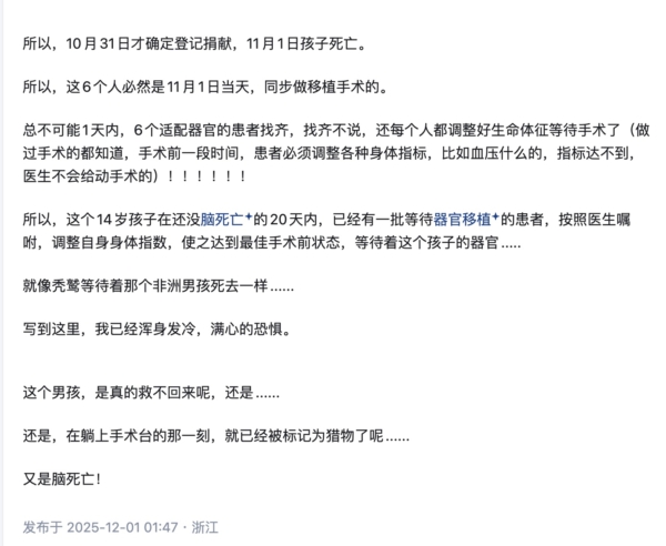 網民質疑,「10月31日才確定登記捐獻,11月1日孩子死亡。所以,這6個人必然是11月1日當天,同步做移植手術的。總不可能一天內,6個適配器官的患者找齊,找齊不說,還每個人都調整好生命體徵等待手術了(做過手術的都知道,手術前一段時間,患者必須調整各種身體指標,比如血壓甚麼的,指標達不到,醫生不會給動手術的)!!!!!!」