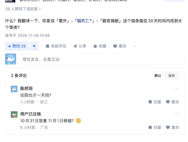 還有網民說,「甚麼?我翻譯一下,你是說「意外」-「腦死亡」-「器官捐獻」這個鏈條能在20天時間內找到6個受體?」