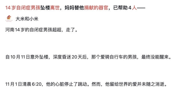 對於該男孩的遭遇,11月4日,曾有知乎帳號「大米和小米」發文《14歲自閉症男孩墮樓離世,媽媽替他捐獻的器官,已幫助4人》,描述了採訪該男孩媽媽的過程。