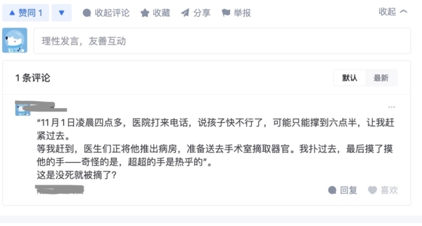 網民說,「這是沒死就被摘了?」「前一天孩子全身冰涼,是不是醫院製造的假象?」
