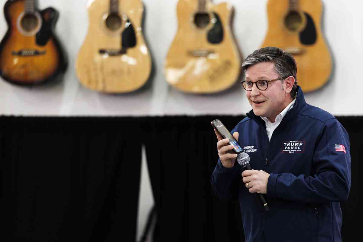 在納士維(Nashville)舉行的競選集會上,前往助選的眾議院議長約翰遜(Mike Johnson)在現場將手機舉到麥克風前,讓現場民眾聽到總統打來的電話。