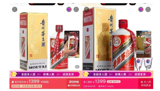 而在11月下旬,拼多多平台就曾經短時間推出1,450元/瓶的拼團價。