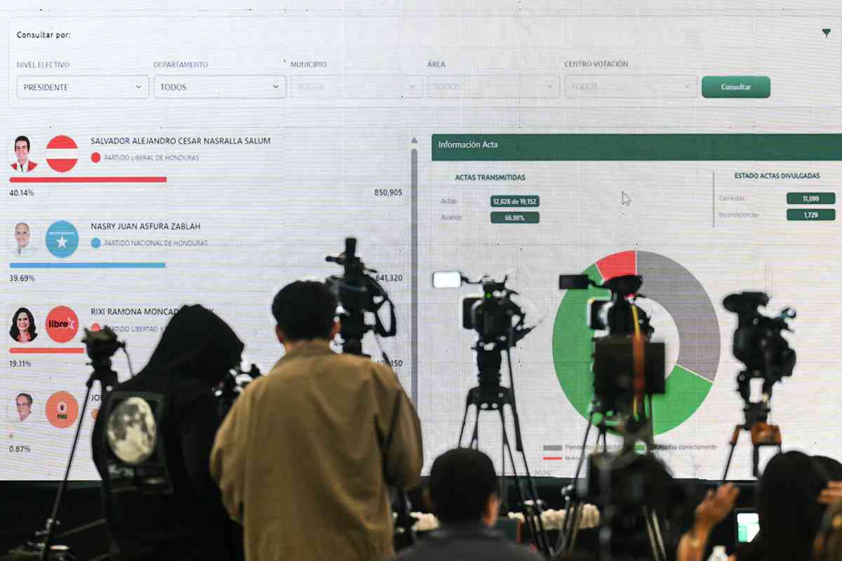 洪都拉斯(Honduras)選舉機構周二(12月2日)晚間公布的統計結果顯示,在約68%的選票完成計算後,納斯拉亞獲得40.13%,阿斯富拉為39.71%,兩者差距僅9,129票。選舉機構表示,兩者現在正處於「技術性平手」(technical tie)。