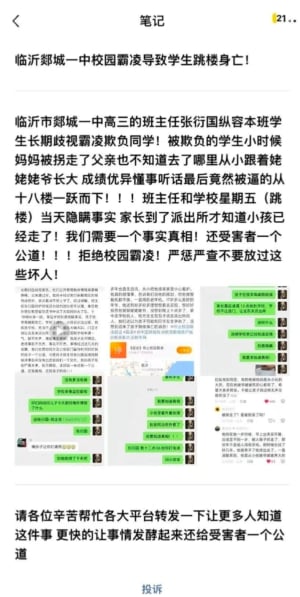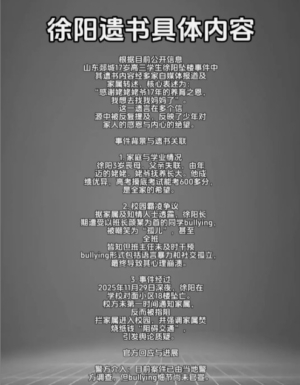 山東臨沂市郯城縣一名高三學生疑因在學校遭受長期霸凌,最終於11月29日晚墮樓身亡。事後,親屬不滿校方隱瞞真相、包庇霸凌者,因而拉棺材到校門口追責、討說法。