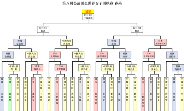 12月4日,第八屆「吳清源盃」世界女子圍棋公開賽八強戰結束,中、日、韓三國女子圍棋第一人周泓余、上野愛咲美、崔精,以及韓國天才少女金恩持,紛紛擊敗對手,躋身四強。