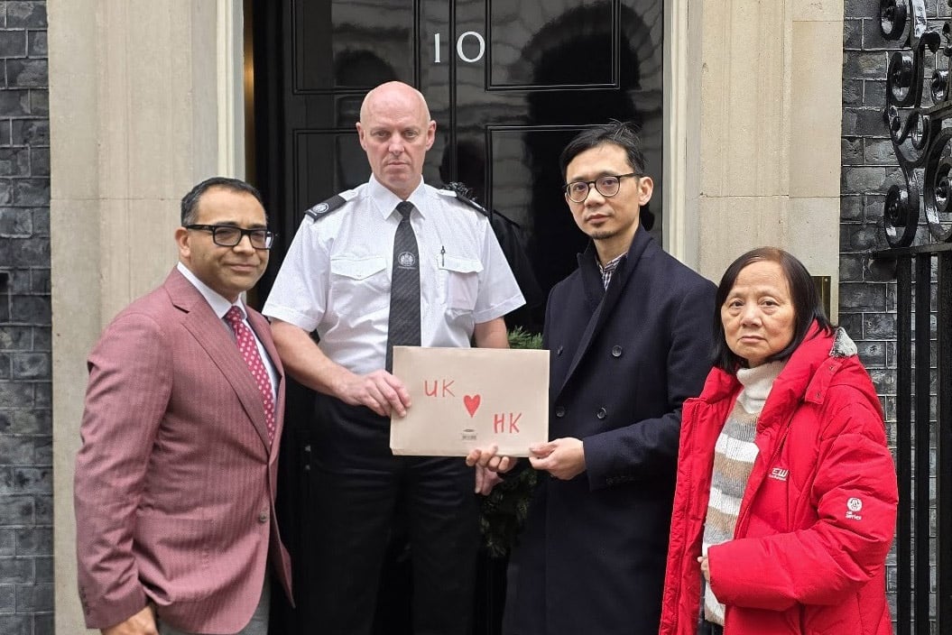 昨日上午11時,蔡嘉源與支援難民與新移民組織Sanctuary Foundation總監Krish Kandiah博士等人到首相府遞交聯署信,並獲得首相府職員接收信件。