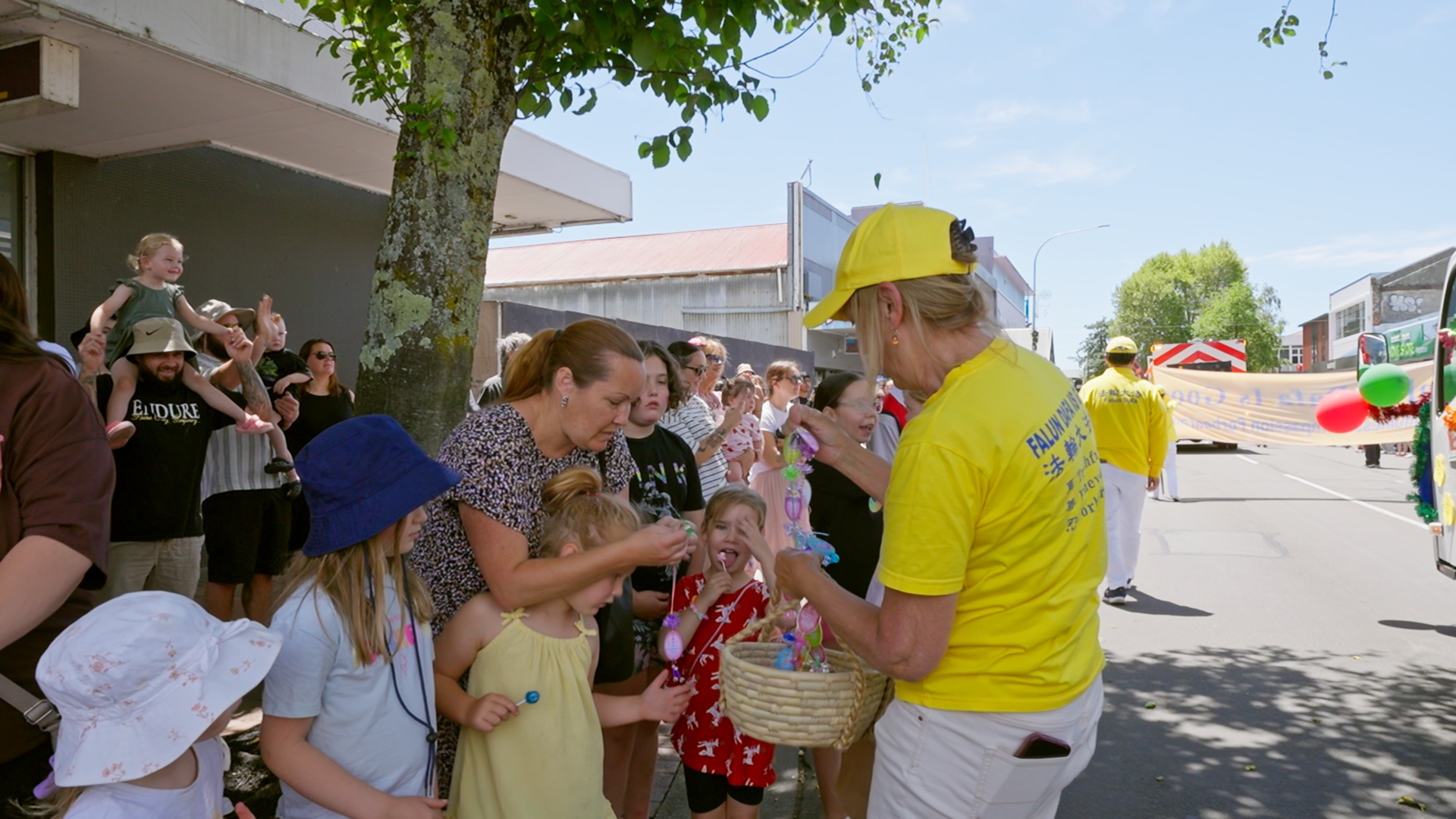 2025年11月29日,紐西蘭部份法輪功學員參加了馬斯特頓(Masterton)聖誕遊行。圖為法輪功仙女花車參加遊行,法輪功學員送給孩子們小蓮花。(夏興/大紀元)