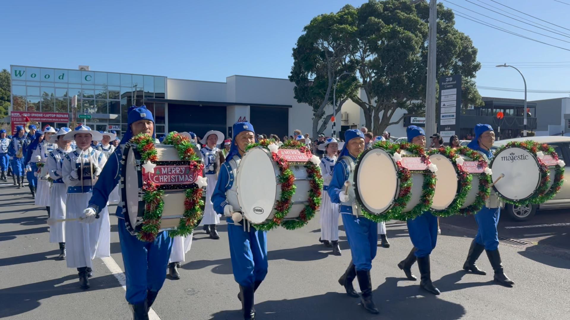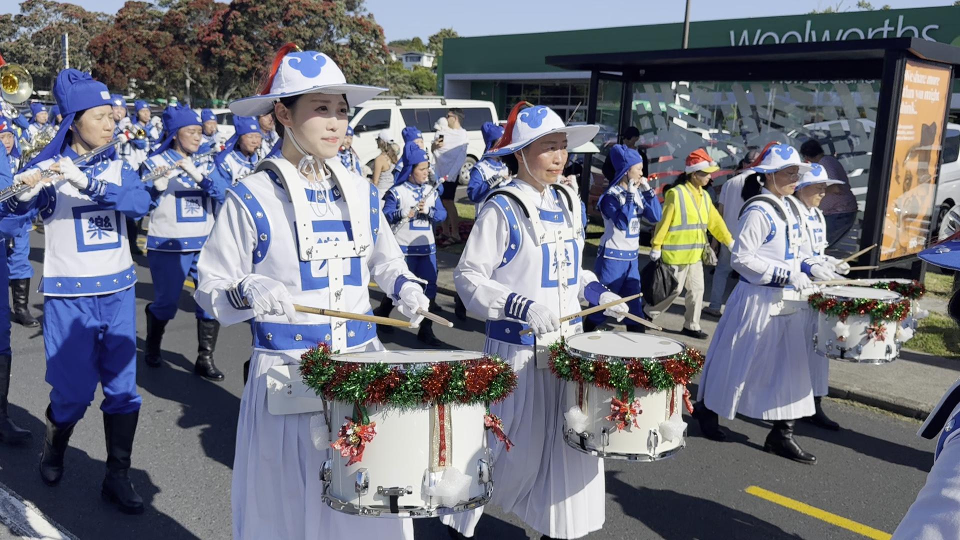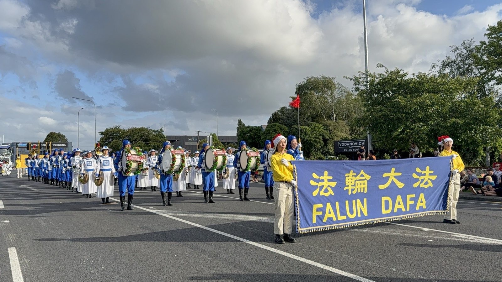 2025年11月29日,紐西蘭部份法輪功學員參加了奧雷瓦(Orewa)聖誕遊行活動,圖為參加遊行的法輪功天國樂團。(李清/大紀元)