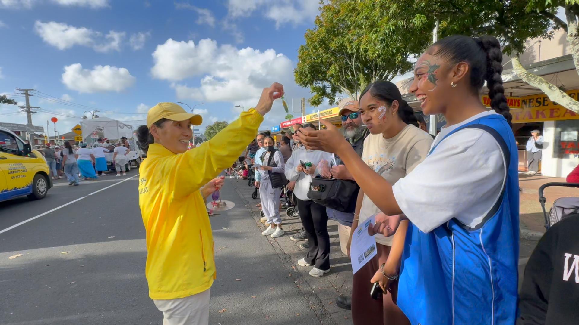 2025年11月29日,紐西蘭部份法輪功學員參加了奧雷瓦(Orewa)聖誕遊行活動。圖為法輪功隊伍參加遊行,路邊的女孩們早早伸出手來,期待得到來自法輪功的禮物。(李清/大紀元)