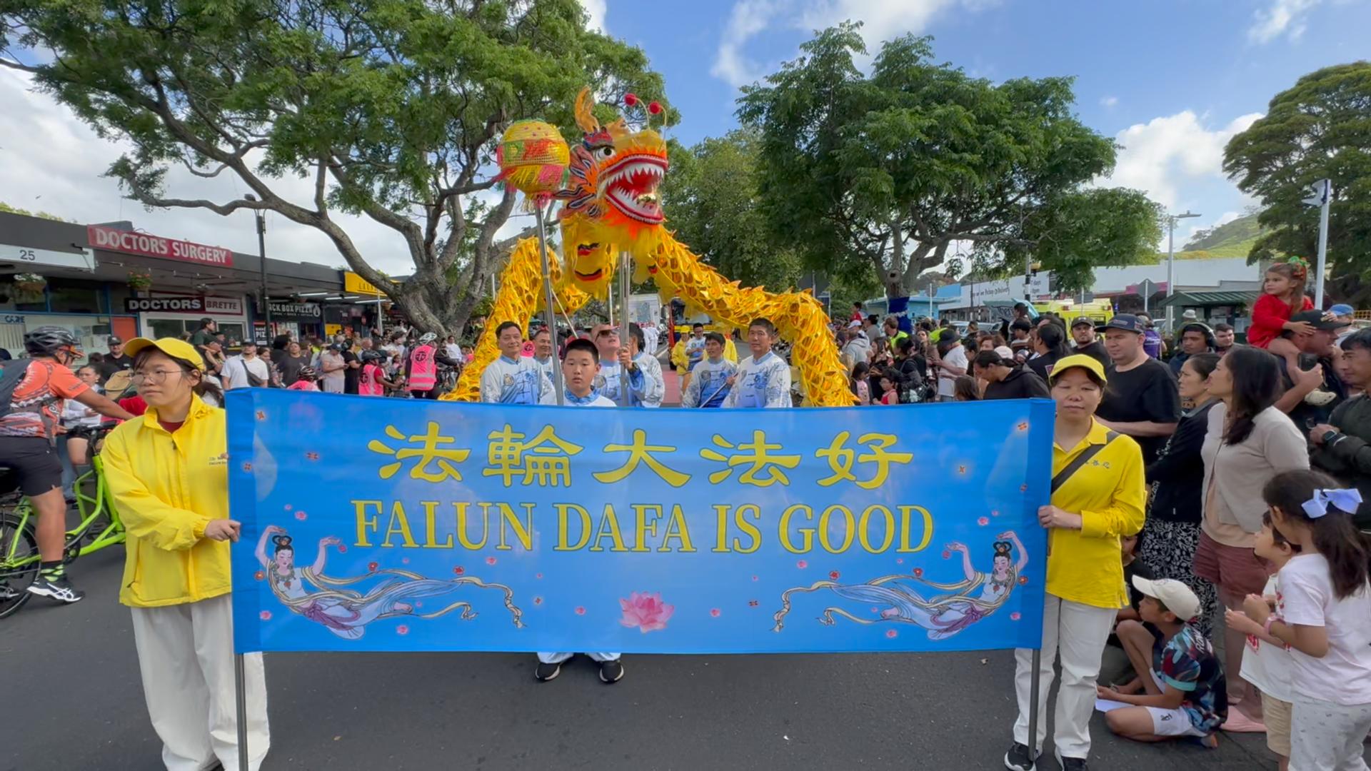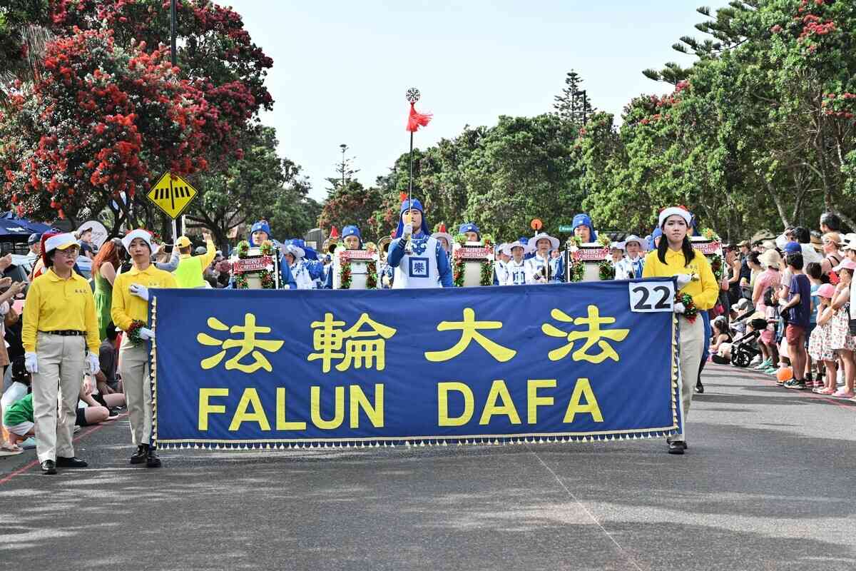 2025年11月29日,紐西蘭部份法輪功學員參加了奧雷瓦(Orewa)聖誕遊行活動。圖為法輪功隊伍參加遊行。(李清/大紀元)