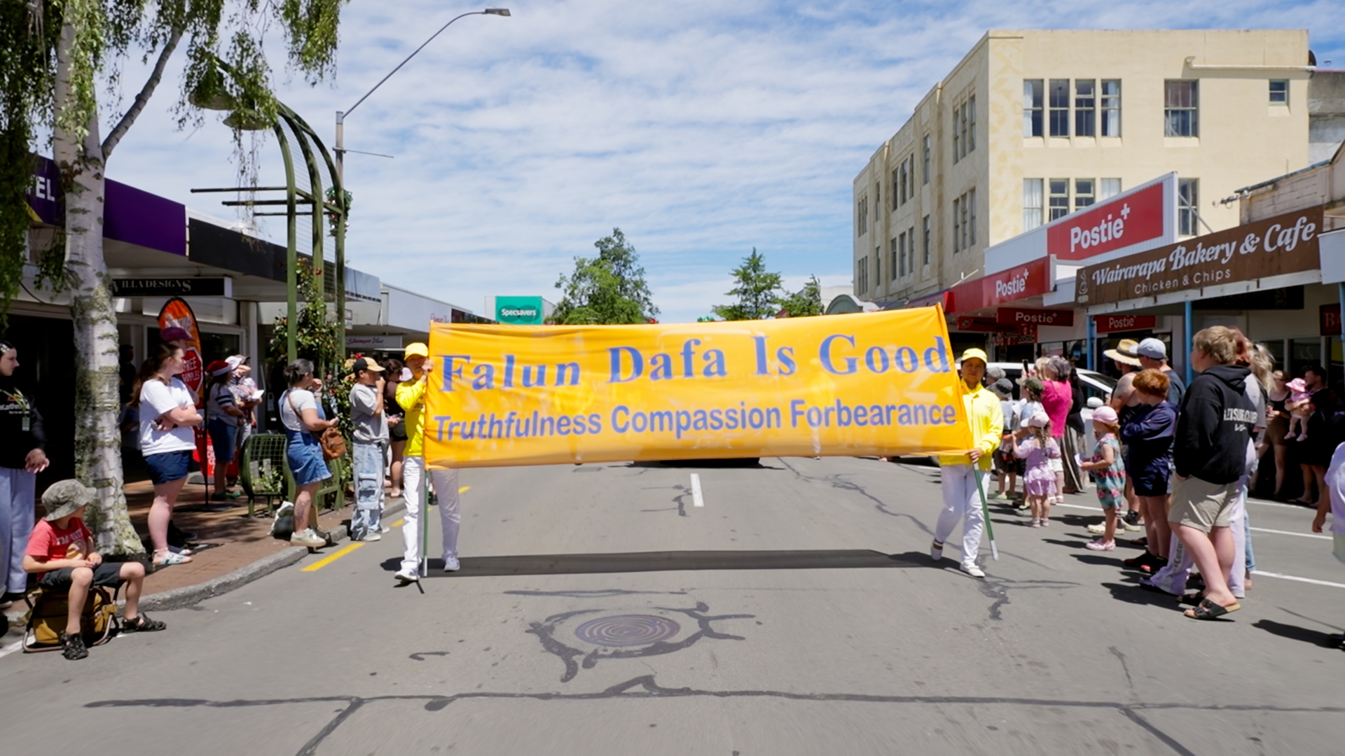 2025年11月29日,紐西蘭部份法輪功學員參加了馬斯特頓(Masterton)聖誕遊行活動。圖為法輪功隊伍參加遊行。(夏興/大紀元)
