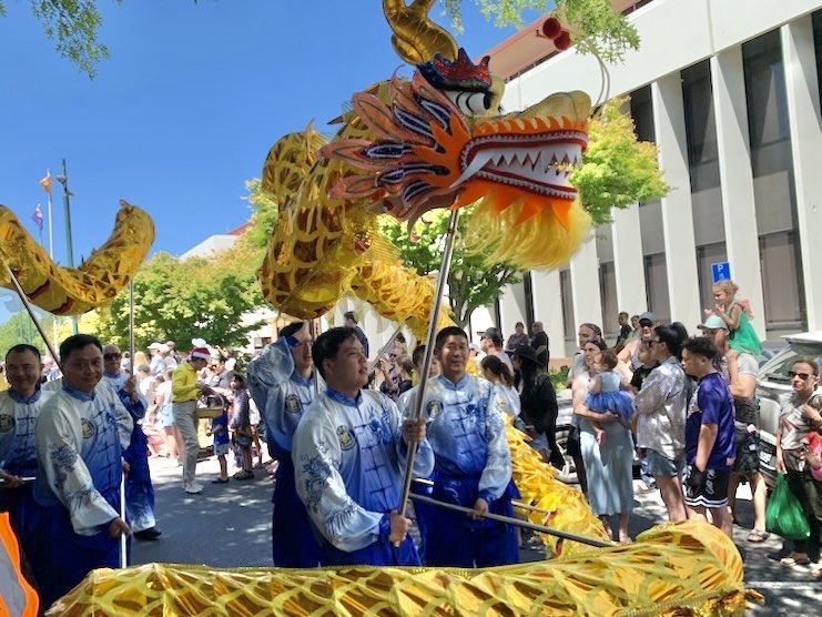 2025年11月29日,紐西蘭部份法輪功學員參加了羅托魯瓦(Rotorua)聖誕遊行活動。圖為法輪功舞龍隊參加遊行。(李玉/大紀元)