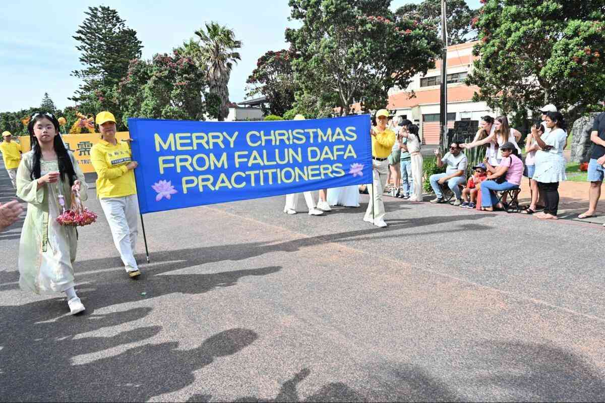 2025年11月29日,紐西蘭部份法輪功學員參加了奧雷瓦(Orewa)聖誕遊行活動。圖為聖誕遊行隊伍。(李清/大紀元)